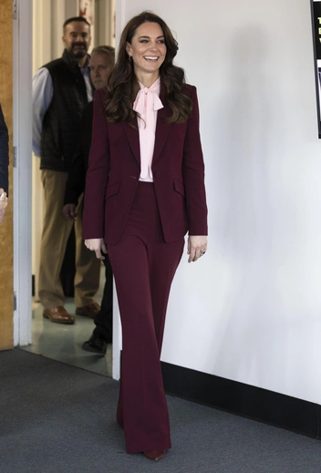 В этом темно-ягодном варианте от французского модельера Ролана Муре Кейт появилась на премии Earthshot в Бостоне. Эта премия — инициатива принца Уильяма, а выдают ее за лучшие достижения в области экологии. Кейт дополнила образ нежно-розовой блузой — это одно из удачных сочетаний с бордовым. По поводу кроя — брюки клеш делают любые ноги стройными, особенно в сочетании с высоким каблуком, как у Кейт Миддлтон.