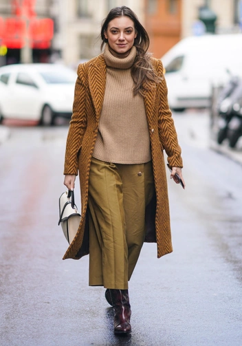 Одна из частых ошибок — выбор верхней одежды в пол. Да, две горизонтали визуально вытягивают, но если у вас невысокий рост, лучше остановиться на моделях длины миди. Здесь также работает правило вертикалей, а вместе с тем, появляется «воздух» в нижней части, за счет чего она не выглядит слишком громоздкой. Если же длины макси не избежать, дополняйте ее обувью на каблуке.
