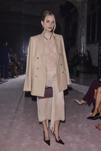 Особенно среди звездных гостей отличилась Леони Ханне. Немецкая модель появилась на показе в бежевом ансамбле: прозрачное платье, пиджак, туфли, клатч и золотое ожерелье как модный аксессуар. Блогер Лу-Энн Пой также решилась на нежный образ, выбрав атласное сиреневое платье в пол от Victoria Beckham, собранное на талии, и не забыла дополнить наряд солнцезащитными очками (все по заветам госпожи Бекхэм) и комплектом блестящих сережек.