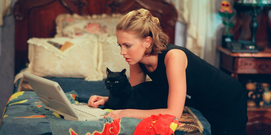 Салли и Джиллиан принадлежат к древнему колдовскому роду, однако в жизни выглядят совсем не так, как мы привыкли — без шляп, готических платьев и яркого макияжа. Лента режиссера Гриффина Данна с Сандрой Буллок и Николь Кидман вышла в 1998 году, и на экране мы видим все главные метки стиля того времени: кроп-топы и укороченные майки, джинсы в мужском стиле, вязаные кардиганы. И даже если ведьминская эстетика вас совсем не привлекает, советуем присмотреться к картине для составления своего базового гардероба.