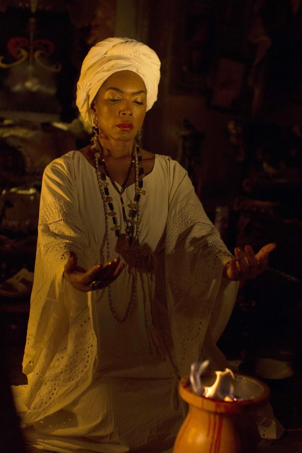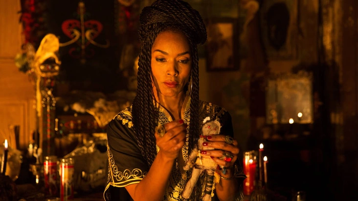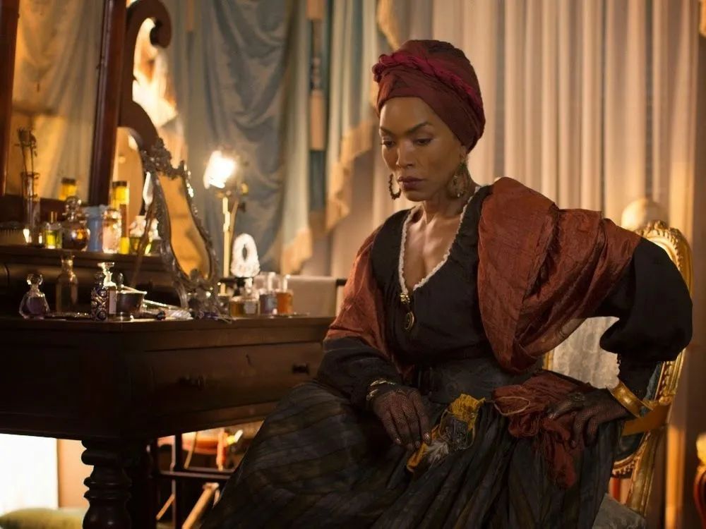 Костюмы для режиссера Райана Мерфи всегда играют особенно важную роль. Поэтому не было сомнений, что в одной из его самых культовых сериалов все героини будут выглядеть стильно и ярко. Третий сезон «Американской истории ужасов» был посвящен истории Мари Лаво — королеве вуду из Нового Орлеана и одной из самых знаменитых ведьм Америки (читайте также: Мари Лаво: история королевы вуду из Нового Орлеана). Ее роль исполнила Анджела Бассетт, которой особенно идут природные оттенки, активные принты, массивные и эклектичные украшения.