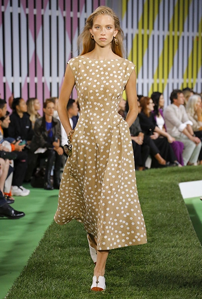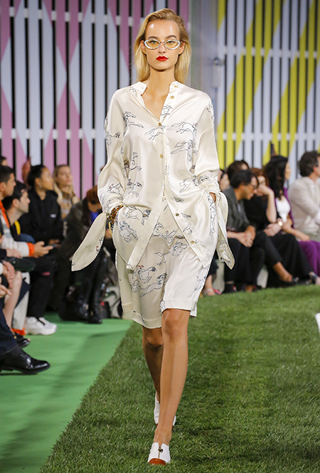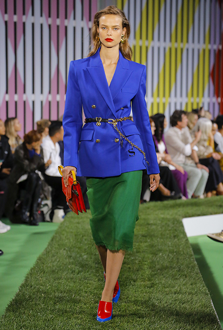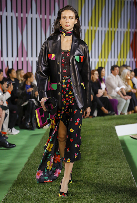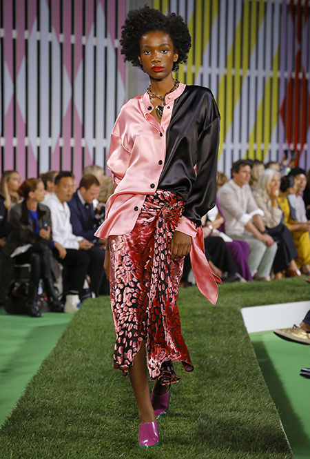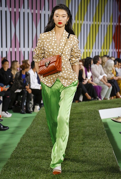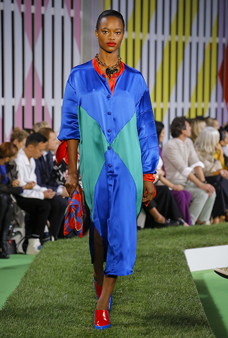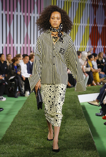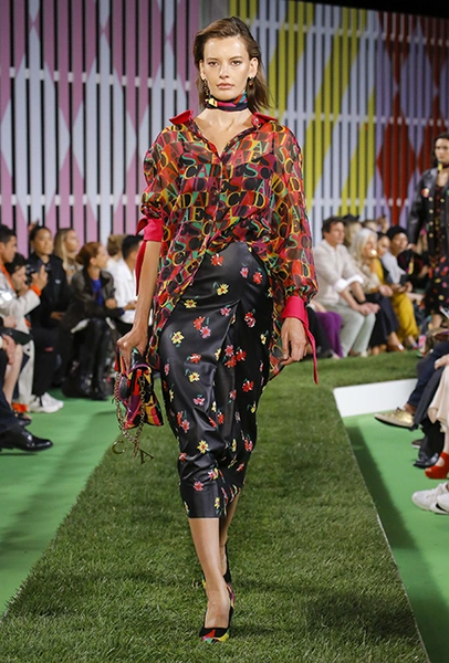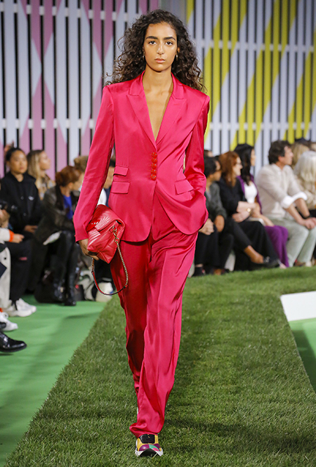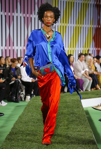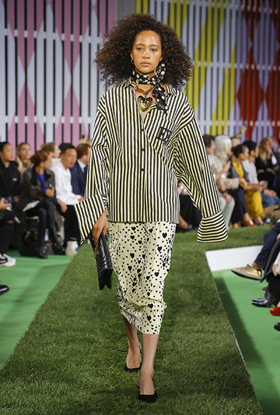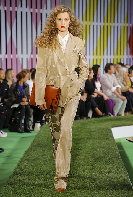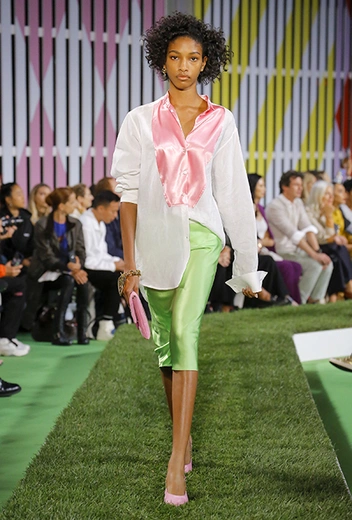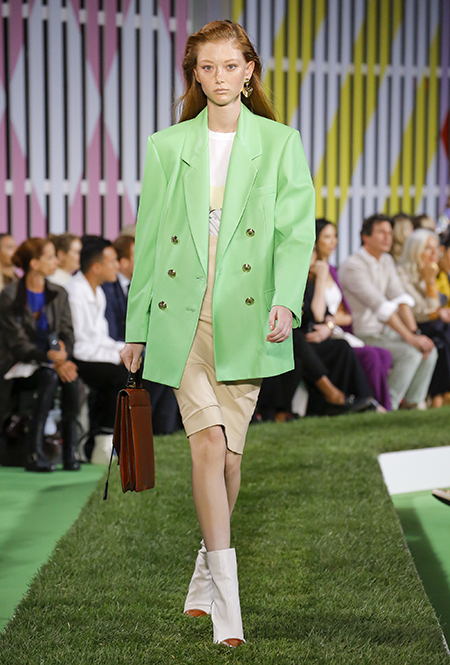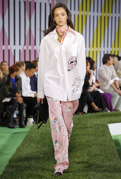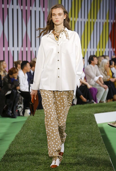 Вдохновение Нейл Слоун искал в архивах домах сразу нескольких декад: конец 70-х, 80-е и 90-е. Маскулинные фасоны жакетов, которые когда-то активно продвигала сама Лэй, не лишены женственности: выполненные из шелка с отливом, с контрастными пуговицами или неожиданных сочных оттенков — так пиджаки на несколько размеров совсем не смотрятся грубо. Слоун смело микусует фуксию с ядовито-зеленым, горох и графику, как это когда-то делали основатели бренда, показывая, что и спустя 40 лет цвет может по-новому раскрасить привычный гардероб. А мы учимся у бренда, как делать это с оглядкой на современность.