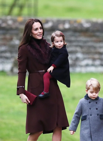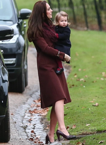 В 2016-м Кейт привезла семью в свой родной город в графстве Беркшир на каникулы, и Кембриджские были запечатлены направляющимися на рождественскую церковную службу в церкви Святого Марка в Энглфилде отдельно от Виндзоров. Для этого случая герцогиня выбрала темно-бордовое пальто с меховым воротником и ремешками на поясе и рукавах, туфли в тон на толстом каблуке и с похожими ремешками, а также немного более яркий бордовый замшевый клатч. По оттенку он сочетался с колготками Шарлотты и галстуком Уильяма.