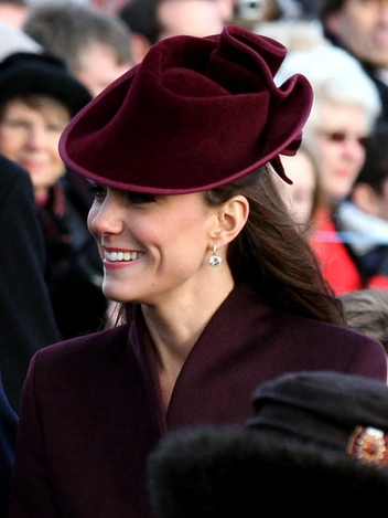 Первое Рождество герцогини Кембриджской в Сандрингеме (а Кейт, в отличие от некоторых королевских невест и женихов отказывалась от приглашений монарха до свадьбы с ее внуком) определенно остается самым стильным — идеально посаженное темно-бордовое пальто с элегантной бархатной шляпой Jane Corbett в тон, сдержанные черные туфли и плотные колготки — этот комплект смотрится актуально до сих пор.