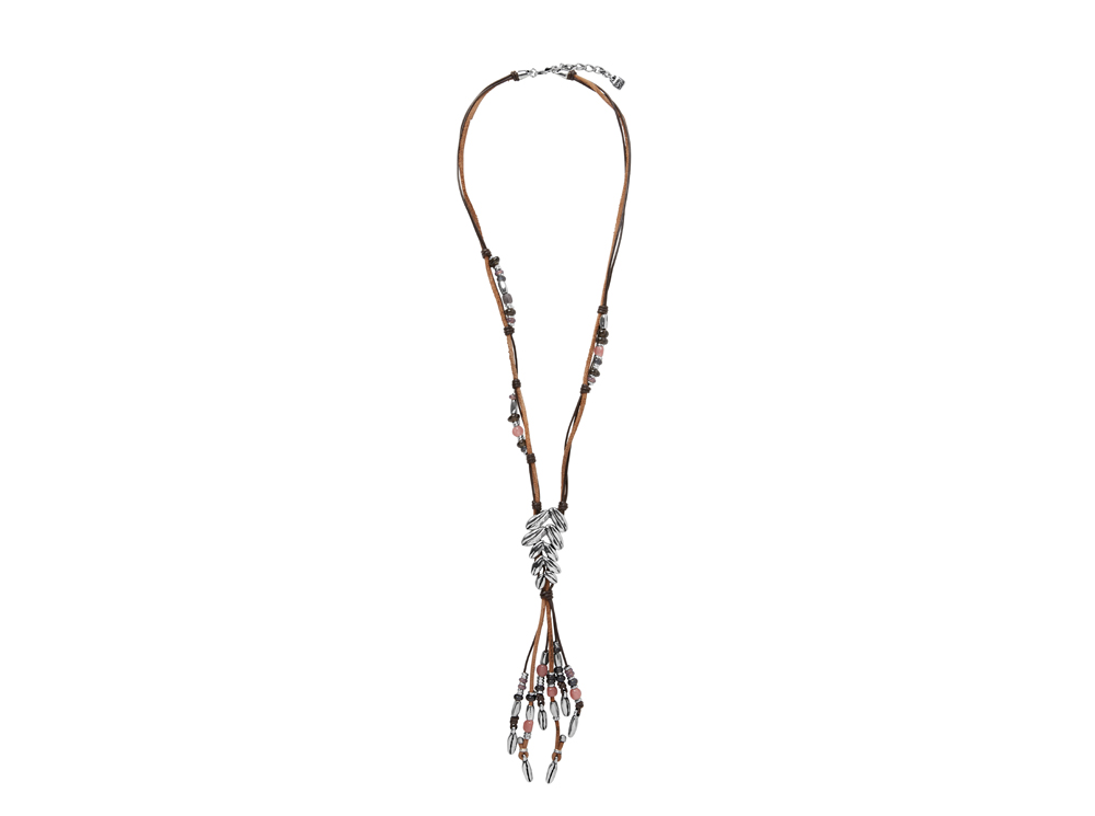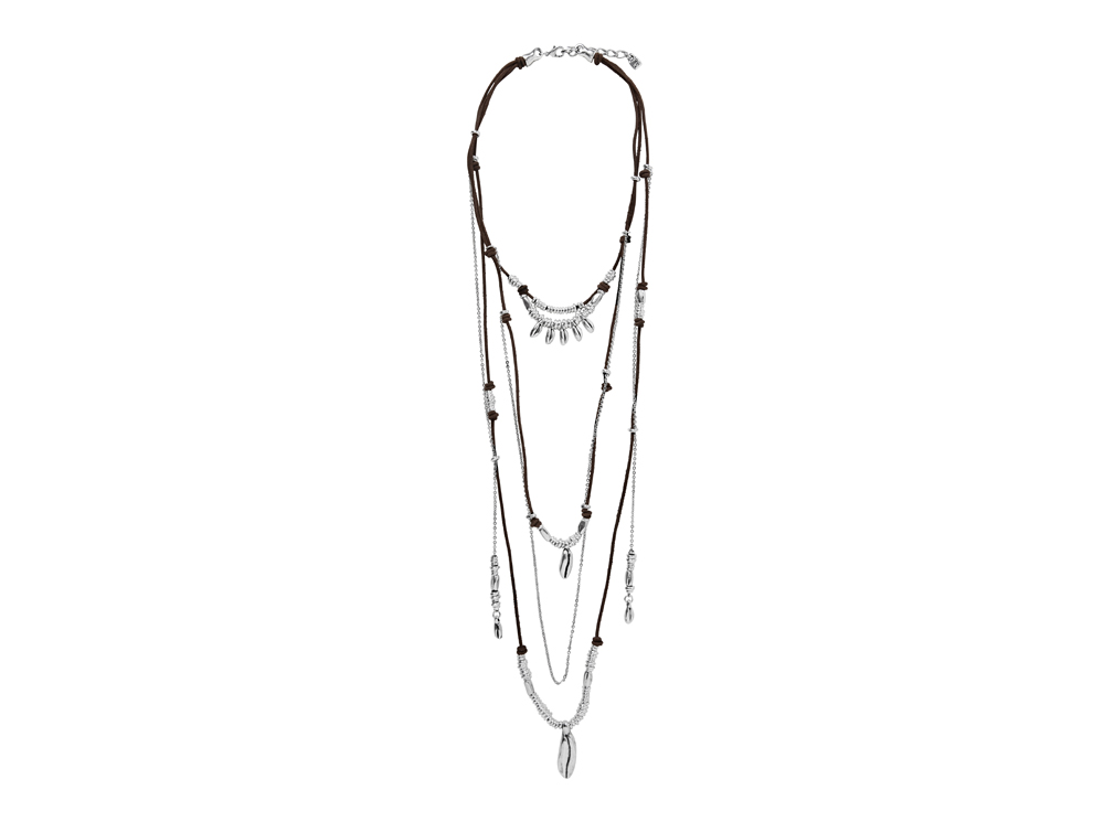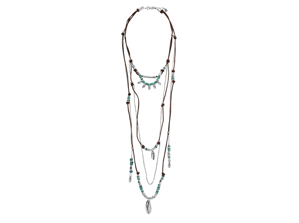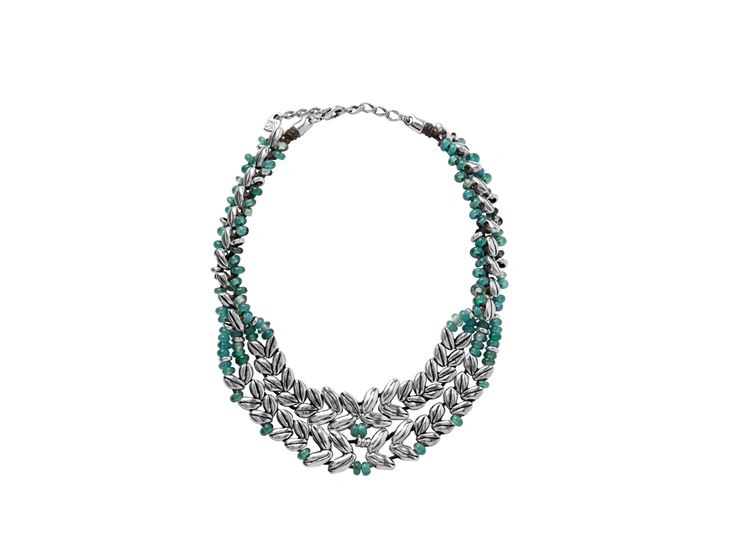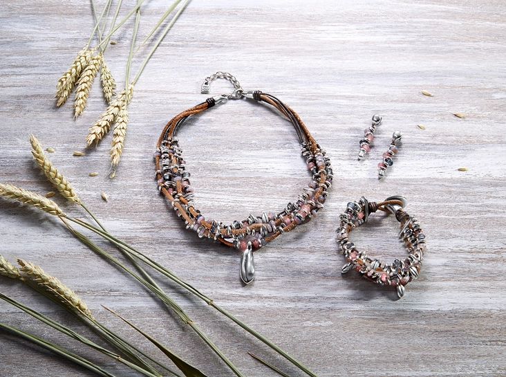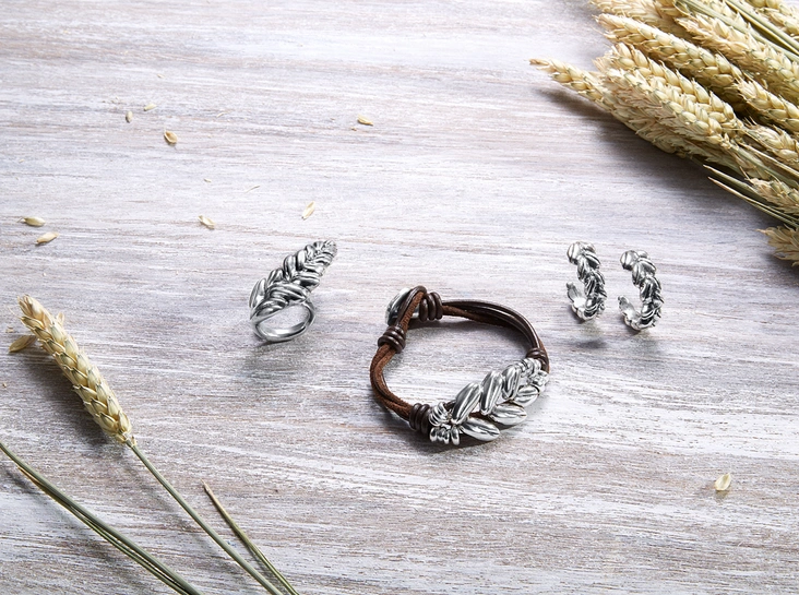 В коллекцию вошли десятки фактурных колец, браслетов и серег из светлого металла и кожи, декорированные камнями цвета нежной бирюзы и лаванды, а также подвесками в виде зерен, колосьев, перьев и зубов диких животных.