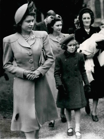 Часть военных и послевоенных лет гардероб наследной принцессы отвечал таким трендам этого времени, как объемный крой, увеличенная линия плеча и крупные головные уборы. Как и многим другим британкам, юной Елизавете такая одежда могла придавать уверенности и создавать ощущение защищенности. В пальто и головном уборе с левой фотографии Елизавета появилась на свадьбе леди Энн Спенсер (тети принцессы Дианы).