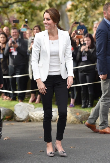 В ассортименте американского бренда J.Crew можно найти вещи различных ценовых категорий — в том числе и довольно бюджетные. К этому лейблу Кэтрин обращается довольно часто, что вполне понятно: марка создает немало классических и вневременных вещей как раз в духе стиля Кэтрин. Например, сдержанные лоферы в клетку, которые во время тура в Канаду в октябре 2016 года она ловко сочетала с другой бюджетной вещью — белым блейзером Zara.