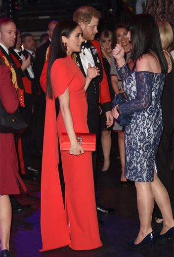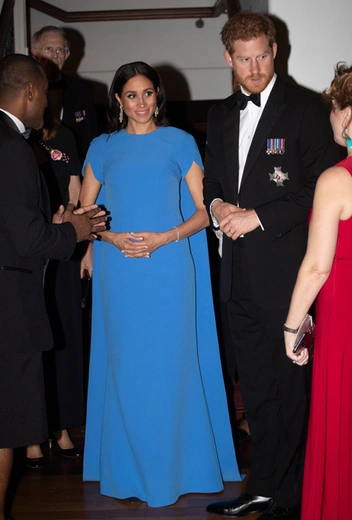 Красное платье-кейп лондонской марки Safiyaa, клатч Manolo Blahnik, серьги Simone Rocha и туфли Stuart Weitzman (которые мы уже видели во время визита в Биркенхед) – Меган моментально напомнила всем, насколько легко она умеет производить впечатление на публику. Интересно, что похожий образ уже есть в ее гардеробе – в платье-кейпе Safiyaa в пол небесно-голубого оттенка она появлялась во время своего первого масштабного тура по Австралии и Океании – еще один важный трибьют своей насыщенной королевской жизни, с которой она рада расстаться.