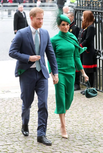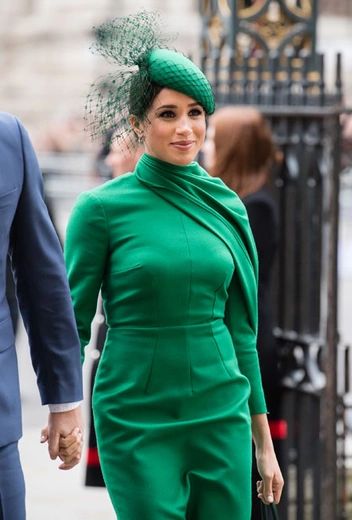 Финальным аккордом прощального «лондонского» тура герцогини стала служба в Вестминстерском аббатстве. Меган выбрала для торжества кастомизированное платье изумрудно-зеленого цвета с длинными рукавами и драматическими деталями от лондонского дизайнера Эмилии Викстед (фаворита герцогини Кембриджской и дизайнера, с которым Меган активно сотрудничала во время начала своей королевской карьеры: Дизайнер Их Высочеств: за что королевская семья любит Эмилию Викстед). Меган дополнила свой образ подходящей шляпкой с вуалью от William Chambers, маленькой сумочкой Gabriela Hearst (бестселлер Nina) и бежевыми лодочками Aquazzura.