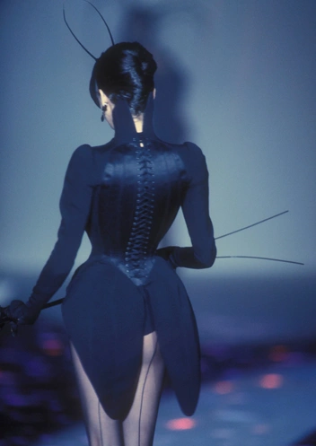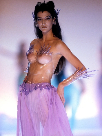 Кутюрная коллекция Thierry Mugler весны-лета 1997 года называется Les Insectes, и, возможно, это лучшая иллюстрация стиля французского дизайнера. Выступая в жанре высокой моды, он превзошел самого себя, представив мир, в котором женщины слились с насекомыми, переняв их характеристики: панцирь, громадные затемненные очки, напоминающие глаза мухи, усики, грациозные мерцающие крылья бабочки.