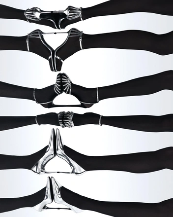 Среди ключевых изделий: туфли, слингбэки и босоножки на шпильках разных высот, а также модели на плоском ходу. Знакомые силуэты выполнены в серебряной коже с зеркальным эффектом и в классическом черном цвете. А главные атрибуты вечеринок, мини-сумки, представлены в разных формах.