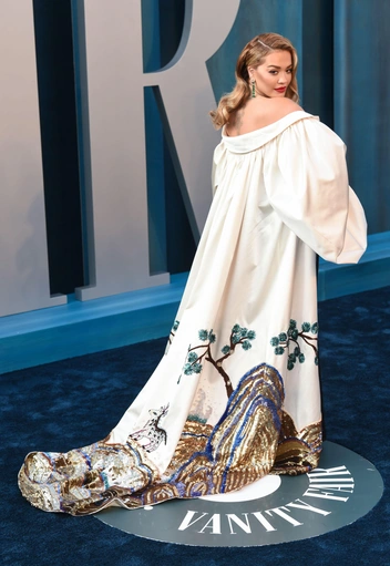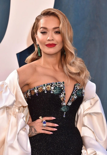 И снова роскошный образ Рита Ора выбрала для Vanity Fair. В 2022 году певица появилась на вечеринке в черном блестящем платье и длинной, расшитой кристаллами накидки от дизайнера Сохи Парк.