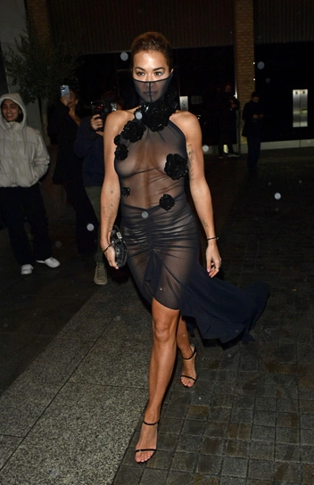 Еще один смелый наряд в коллекции выходов певицы — ее появление на прошлогодней благотворительной вечеринке британского журнала Vogue. Рита Ора выбрала полностью прозрачное платье из сетки David Koma с воротником-маской и акцентами из блестящих цветов.
