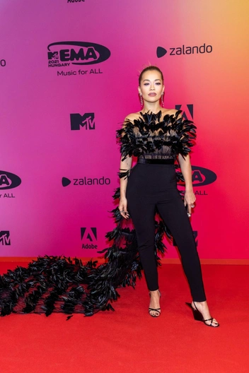 А в 2021 году певица доказала всем, что брючные костюмы могут быть не менее стильными, чем вечерние платья. Для церемонии премии MTV Europe Music Awards Рита Ора выбрала черный наряд без бретелей с облегающими штанами и корсетным топом, который был полностью задекорирован перьями.