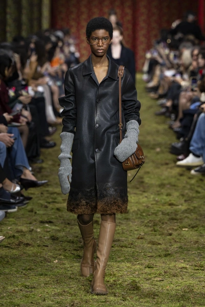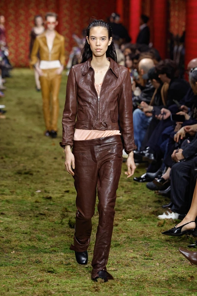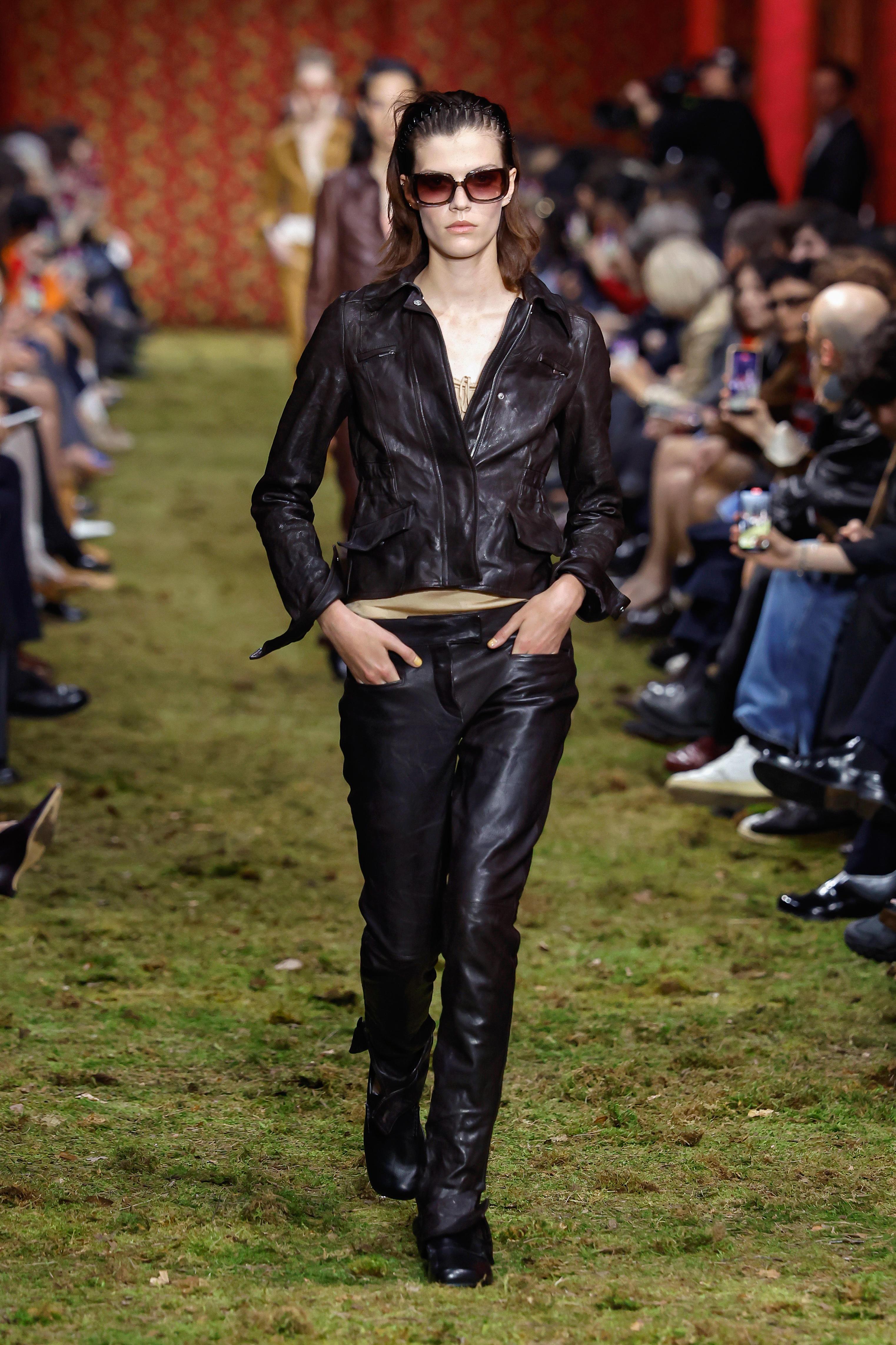 Городские же пространства, судя по всему, мы будем покорять исключительно в двух сочетаниях. Первое — микс зауженных кожаных брюк и укороченных курток. Здесь у вас могло возникнуть дежавю, ведь всего пару недель назад похожий микс мы видели на показе Демны для Gucci.