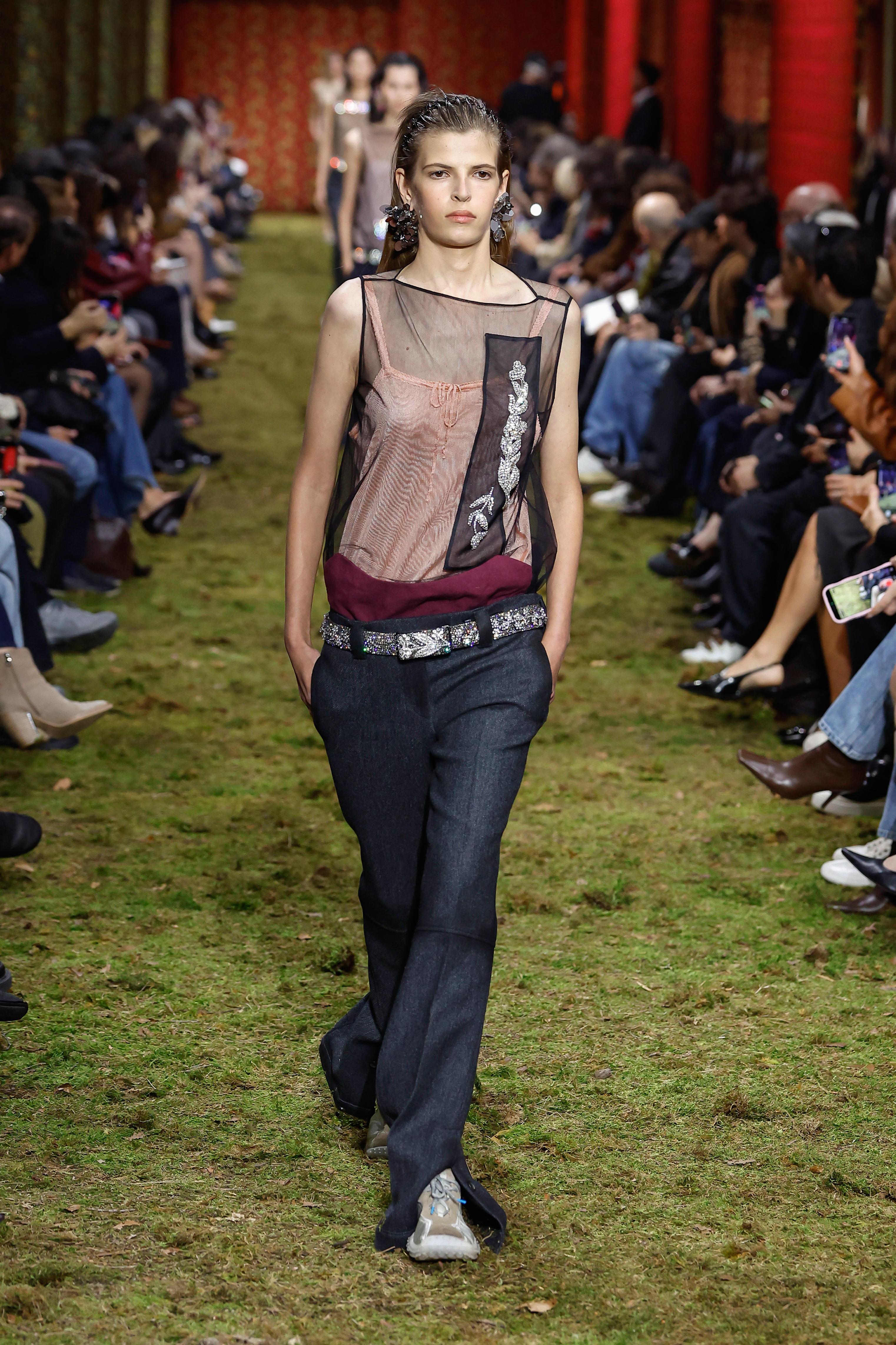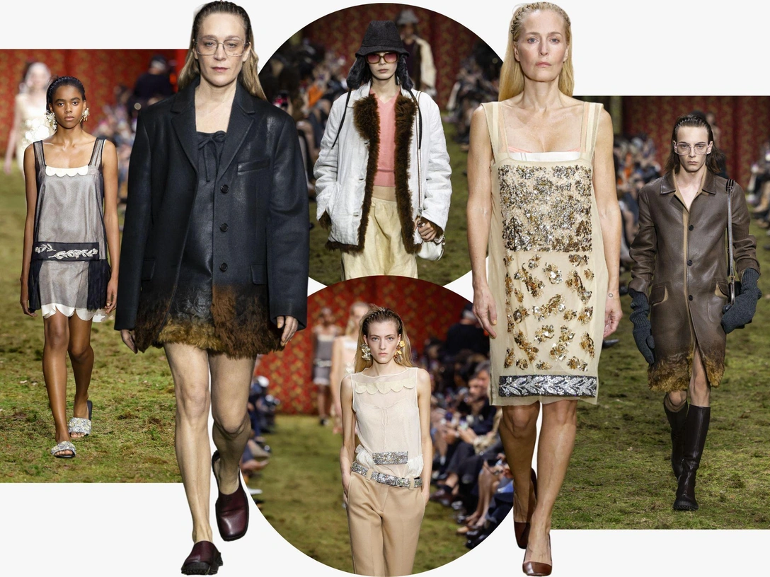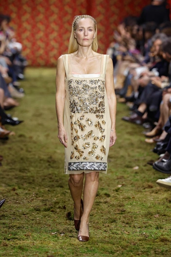 Дальше Миучча Прада вводит резкий контраст: после познания дзена на природе, походов до офиса и прогулок по городу, отправляет нас на тематическую вечеринку. Как и Матье Блази, она ностальгирует по 1920-м, поэтому с легкостью возвращает в наш обиход платья-флэпперы. Но не простые, а многослойные: дизайнер предлагает поиграть с бельевыми сочетаниями, надев под расшитое кристаллами платье комбинацию и цветной лиф. Такой образ, например, достался Джиллиан Андерсон — это первый раз, когда актриса выходит на подиум итальянского Дома.