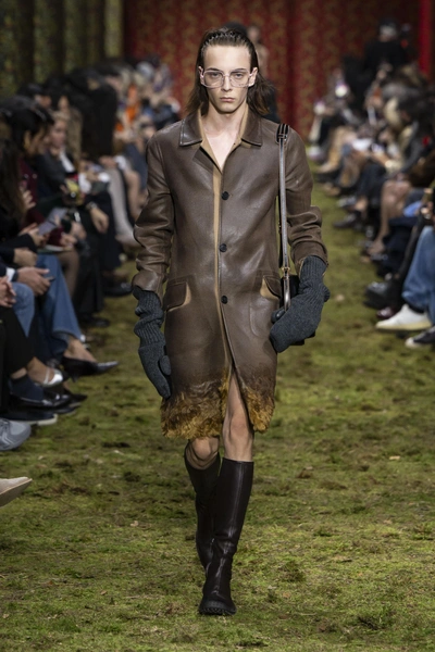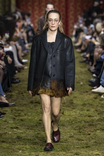 К слову, следом на шоу выводят еще одну кино-звезду. На этот раз перед зрителями предстает Хлое Севиньи. Она получила пару из кожаного платья и пиджака с необычной отделкой — «градиентом» из меха (читайте также: Первый (второй, третий и четвертый) выход Беллы Хадид на шоу Prada).