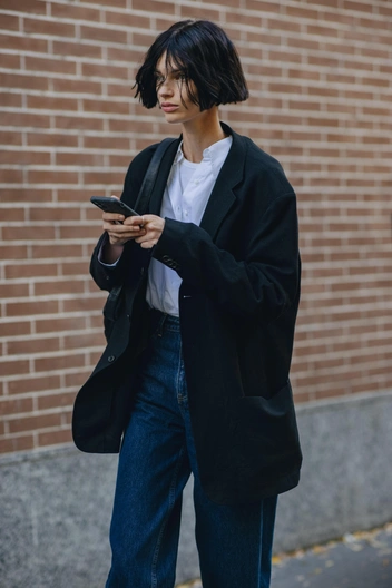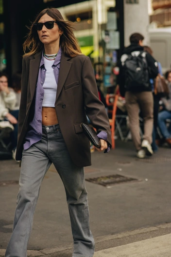 Что по пропорциям? Я советую носить джинсы длинного кроя, чтобы выдержать пропорции общего силуэта 50 на 50 или 60 на 40. Это очень эстетично. Также можно носить джинсы-скини с объемными сапогами, чтобы уравновесить оверсайз-жакет.