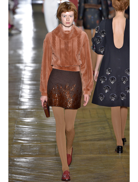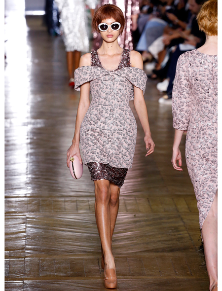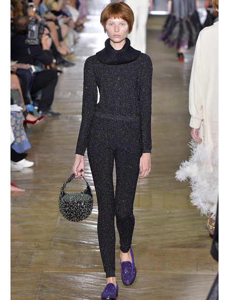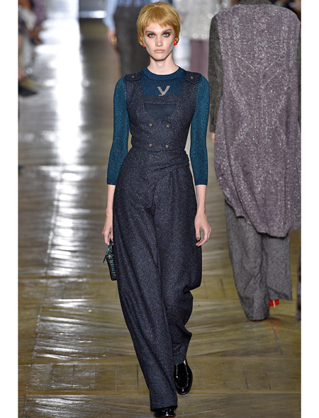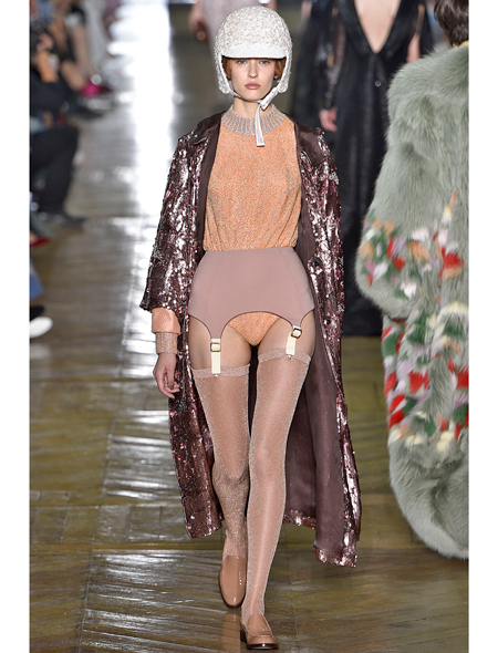 Люрекс (если вы не помните, что это такое – спросите у бабушек) и парча, плюш и натуральный мех, нейлон и лаковая кожа – основные материалы новой коллекции. Бельевая тема, которая так популярна в наши дни, раскрыта более чем: искрящиеся (все тем же люрексом) боди, неопреновые бельевые пояса-баски, рекомендованные к употреблению поверх брюк и юбок, или вместо них, по прямому назначению – держать любимые бабушками нейлоновые чулки. Отдельного внимания заслуживают плотные колготки а-ля «советское детство» – красноречиво сморщившиеся под коленками и на подъеме стоп моделей. Только теперь это называется «кутюр».