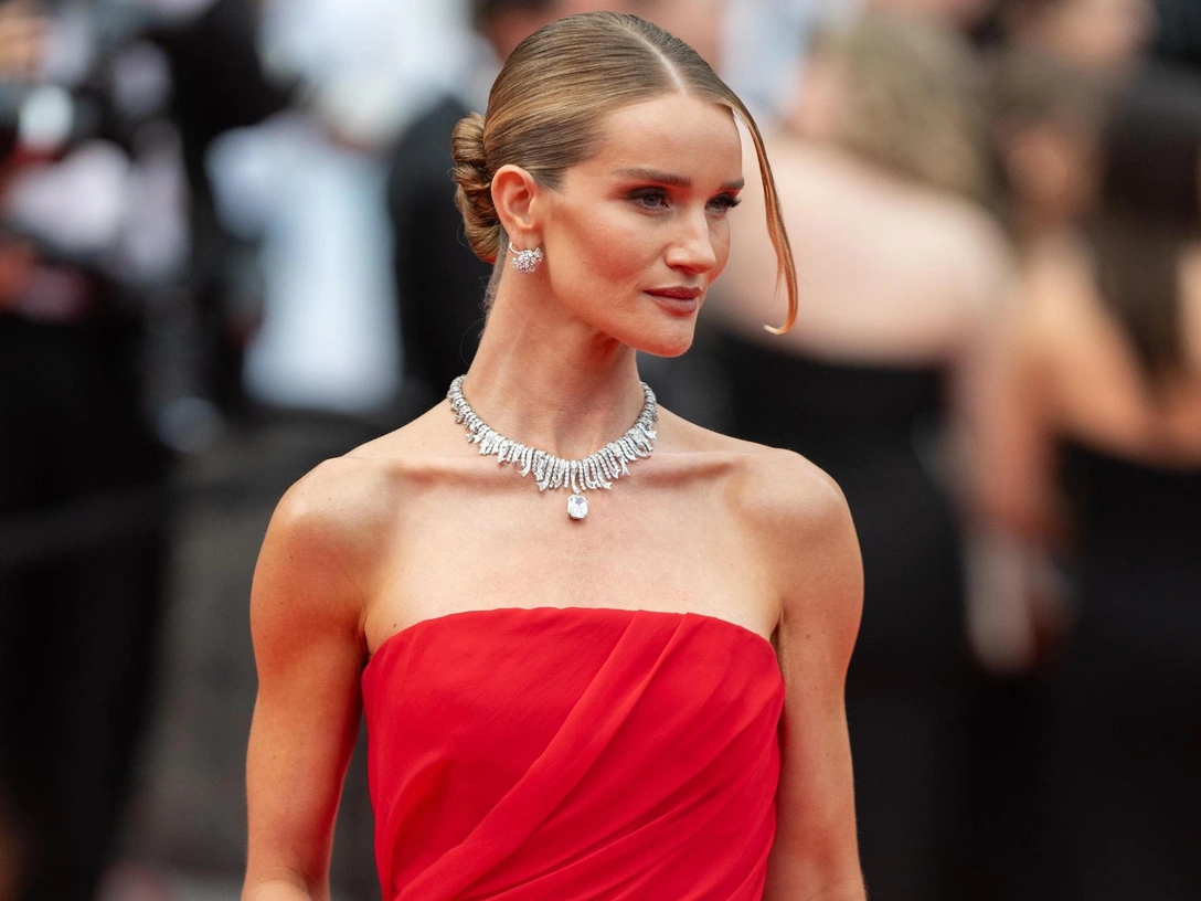 Совсем недавно мы разбирали стиль Роузи Хантингтон-Уайтли и пришли к выводу, что модель носит только бежевый цвет. Не представляем, чего стоило Balenciaga уговорить красавицу на платье алого цвета, но мы-таки получили образ в лучших голливудских традициях — блондинка в красном. Видим фасон бюстье — по данным Tagwalk, самый популярный в 2025 году, асимметричный разрез у подола, что тоже тренд, а также легкий полупрозрачный шлейф, обязательный референс ко всем платьям наступающего лета. На ноги модель надела классические лодочки Balenciaga с острым мысом, а за украшения отвечали Tiffany&Co — с ними у Роузи давний контракт (читайте также: Очки на пол лица, тихая роскошь и еще 6 секретов стиля Роузи Хантингтон-Уайтли).