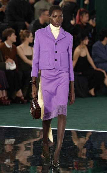 Второй вариант фиолетового на осень — его светлые оттенки. Обсессию по цвету черники с молоком показали сразу два бренда — Gucci представили пальто, Miu Miu выпустили сапоги в стиле нулевых с декоративными ремешками. Уже этот оттенок как раз будет хорош в романтичных интерпретациях: отправляемся в легком платье на свидание, шелковый платок элегантно повязываем на сумку.