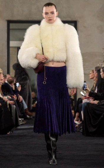 И третий цвет, который точечно, но все же был представлен на Неделях моды осеннего сезона — это что-то среднее между фиолетовым и бордовым. Оттенок напоминает цвет красного винограда и идеально сочетается с чем-то нейтральным — как с бежевой юбкой на показе Chloe. Так мы снова возвращаемся к вечной формуле: яркие цвета составляют гармоничный тандем с нейтральными.