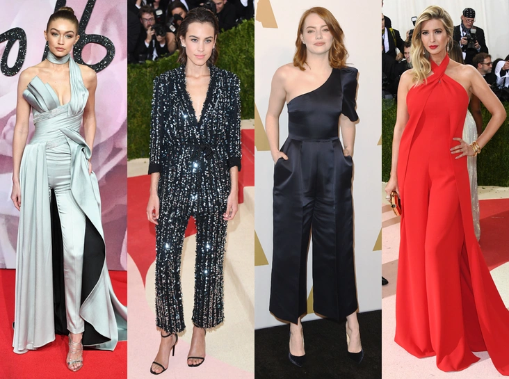 Параллельно красные дорожки самых авторитетных голливудских мероприятий заполоняли комбинезоны, которые, наконец, превратились из повседневной одежды в вечернюю. Их для артисток традиционно готовят бренды Chanel, Elie Saab, Zuhair Murad и Atelier Versace, сумевшие возвести «брючное» в апогей кутюрного искусства. Они усыпают наряды камнями, стразами и многотысячными блестками. Режут их, удлиняют и делают прозрачными в унисон тренду на «голую» красоту.