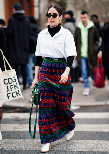 Трикотажное поло с длинным рукавом стало сегодня универсальным предметом гардероба — к нему подходит абсолютно все. Особенно удачно оно смотрится с юбкой-макси. Такое сочетание фигурировало на показах Prada и Fendi. Поло можно носить и с наглухо застегнутыми и полностью расстегнутыми пуговицами. Дополните такой образ актуальными аксессуарами: идеальным дополнением станет актуальное колье с жемчугом или цепь.
