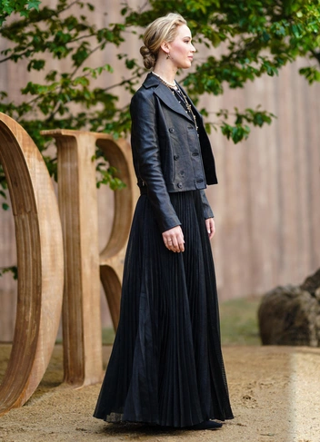 Юбка макси из эко-кожи будет гармонично смотреться с каблуками и рубашкой или жакетом оверсайз. Такую же юбку можно пристроить и в осенне-зимний гардероб. Утепляем образ с помощью колготок, высоких сапог и свитера.