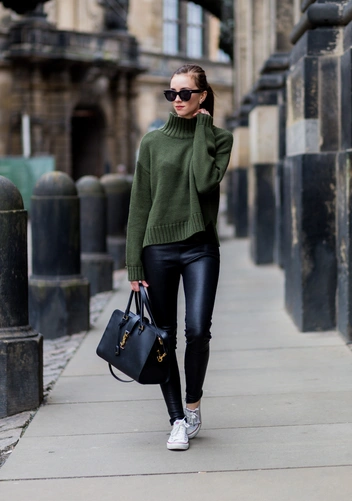 Кожа всегда в моде, но важно правильно выбирать силуэт. На примере с брюками лучше убрать в дальний ящик облегающие модели — леггинсы. Они хоть и привлекают внимание, но при этом подчеркивают мельчайшие и не существенные изъяны вашего тела (читайте также: Как носить спортивные брюки-джоггеры: 6 неожиданных сочетаний). Отдайте предпочтение более расслабленным фасонам, например, прямым или широким брюкам, которые легко стилизовать в гардеробе.