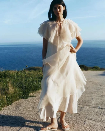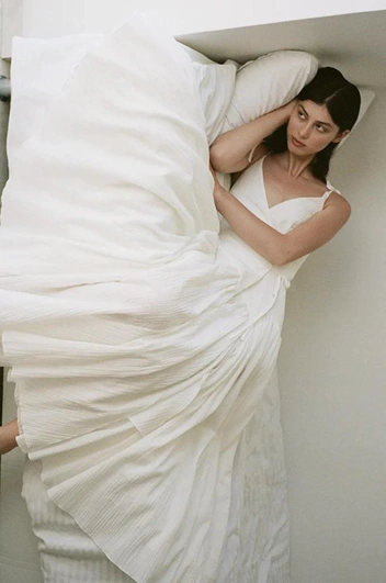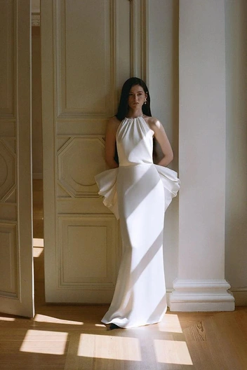 «Мое самое любимое платье из коллекции — внутри команды мы называем его „кувшинка“ — мы повторили в теплом золотистом оттенке шелка, а для белого рифленого платья с арками по линии бедер добавили еще больше слоев нижней юбки, сделав ее пухлее, чтоб платье буквально разбивалось к ногам белой пеной», — поделилась дизайнер.