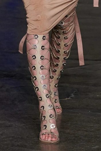 Высокие гладиаторские сандалии регулярно возвращаются на подиум. В этом осенне-зимнем сезоне они стали более смелыми и современными. Rick Owens поставил такие сандалии на высокий каблук, а Dion Lee дополнил эту трендовую обувь металлическими деталями (читайте также: Самые модные босоножки и сандалии лета 2022).