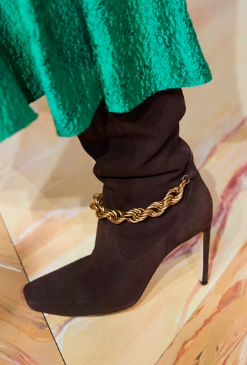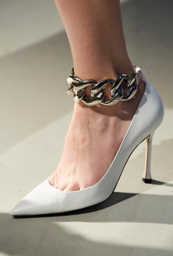 Цепи стали одним из ключевых направлений этого сезона. Теперь они украшают все: от минималистичных остроносых балеток до прочных кожаных сапог для промозглой осени. Какие именно цепи вы выберете – тонкие цепочки, которые дополняют изящные туфли, или массивные металлические звенья, обвивающие голенище ваших ботинок, - не так важно.