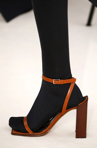 Любимым приемом дизайнеров, очевидно, стало сочетание черных колгот с цветными босоножками (примеры берем у Off-White и Altuzarra), однако есть и примеры довольно элегантного монохрома (например, белые колготки в сочетании с белыми босоножками у Celine или сочетания цвет в цвет у Valentino).