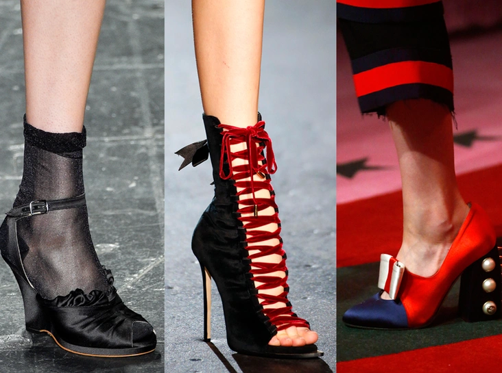 В будущем сезоне обувь на шнуровке войдет с тем же грандиозным ажиотажем, как когда-то в 2000-х. Собственное прочтение модного тренда предлагает Givenchy, демонстрируя многочисленные остроносые туфли-лодочки всех возможных цветов. Невероятно женственно смотрится шнуровка в сочетании с ажурной перфорацией на моделях Emporio Armani, в то время как Versus Versace с помощью шнуровки добавляет немного мужественности полуботинкам цвета хаки.