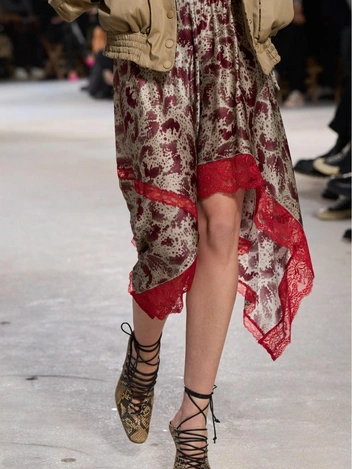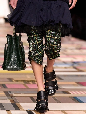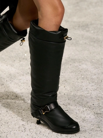 Дизайнеры продолжают развивать тему контрастов: так, на показах мы увидели безупречные сочетания черного и белого оттенков в одном образе или комбинацию тонкого каблука и широкого голенища. Если в коллекции Christian Dior обувь выглядит еще элегантно и гармонично, то Sacai предлагает перейти на сторону маскулинности, отдав предпочтение дерзким ботинкам на каблуке kitten heel (читайте также: 20 главных трендов весны и лета 2025: самый полный гид).