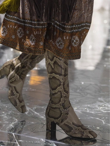 Животный принт продолжает покорять модных девушек и дизайнеров — теперь на передовую выходит имитация змеиной кожи. Она может быть не только на плащах, брюках, юбках, но и сумках, а также на обуви. Какие варианты представили марки? Valentino сделали ставку на сапоги с узким голенищем, а Dries Van Noten — на слингбэки со шнуровкой и сабо.