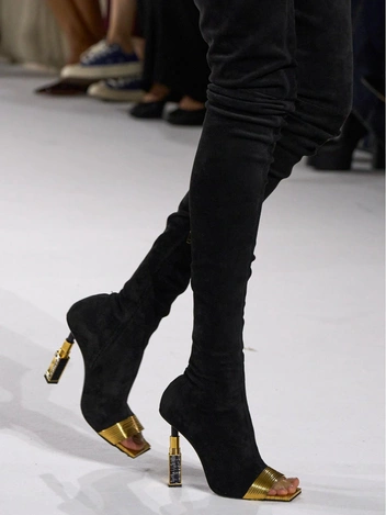 Это могут быть не только привычные нам сандалии, сабо или босоножки, но и сапоги и даже ботфорты с открытым носом, как, например, в коллекции Balmain. При создании образов важно учитывать стилистику обуви: так как она тоже является частью тренда на нулевые, ваша одежда должна соответствовать прошлой модной эпохе.