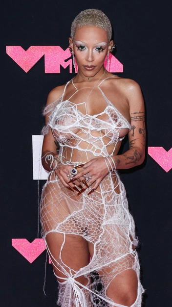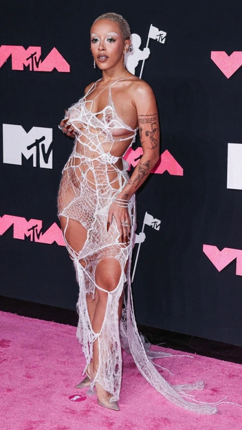 Кажется, для Doja Cat эпатаж и база синонимичны, ведь представить более закрытый образ на ней мы не можем. Знаменитость всегда появляется на публичных мероприятиях в провокационных нарядах, которые одновременно удивляют и шокируют. Например, на MTV Video Music Awards она приготовила «голый» образ, надев телесные трусы и платье-сетку Monse. Образ бренда вдохновлен знаменитой скульптурой паучихи «Маман» художницы Луизы Буржуа.