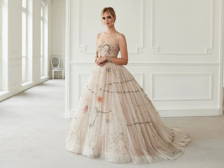 Автор популярного блога The Blonde Salad вышла замуж за музыканта Fedez в 2018 году. Для вечеринки итальянка сменила белоснежное платье с кружевным верхом, рукавами и воротником и пышной юбкой из тафты на более открытый и кокетливый вечерний туалет. Она выбрала каноническое платье Dior с бюстье и пышным подолом, украшенное наивной ручной вышивкой.