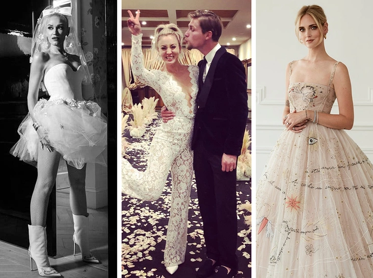 В 2021 году Гвен вышла замуж за кантри-певца Блейка Шелтона. Первое платье исполнительницы было с корсетным лифом с глубоким декольте, многослойной пышной юбкой и длинной фатой, второе — куда более смелое и хулиганское. Еще один плотный корсетный лиф был дополнен хулиганским коротким подолом с наивной вышивкой, вторящей фате в духе 1960-х с ромашками и бантиком в основании. Все это Стефани дополнила сетчатыми колготками и остроносыми сапогами до середины икры.