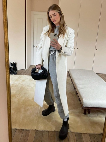 Еще одно беспроигрышное сочетание, которое вам точно нужно повторить в этом осенне-зимнем сезоне — надеть светлые серые джоггеры вместе с грубыми ботинками. Здесь, кстати, работает то же правило, что и с ковбойскими сапогами: заправьте брючины внутрь и слегка вытяните их наружу, как это сделала Келли Разерфорд на первом фото.