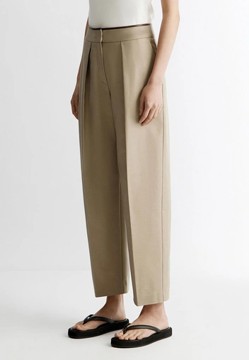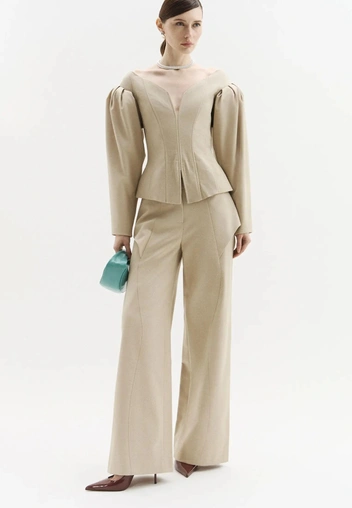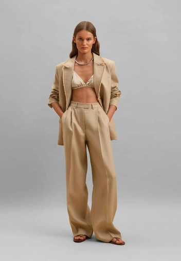 На таком фоне бежевые брюки становятся идеальной базой: они собирают силуэт, мгновенно делают образ дороже и при этом не выглядят как занудная офисная униформа, потому что сегодня их носят максимально расслабленно — с мягким трикотажем, объемными рубашками и балетками или лоферами на плоском ходу.