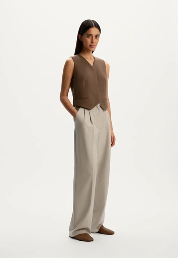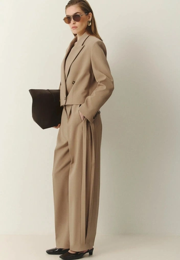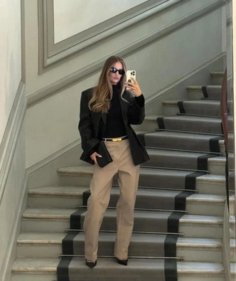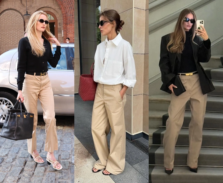Важно и то, что минимализм 90‑х сегодня особенно популярен. Это не «у меня нет фантазии, поэтому я надела бежевое», а «я сознательно убрала все лишнее, чтобы сделать акцент на себе». В гардеробе это читается почти как фешн-заявление: человек, который умеет остановиться на трех вещах, обычно хорошо понимает, чего именно он хочет сказать своим стилем. Добавьте к этому тренд на новый статусный код — когда состоятельность считывается не по логотипам, а по качеству кроя и спокойствию образа, — так бежевые брюки оказываются в центре сразу нескольких модных сюжетов одновременно (читайте также: Тихая роскошь: почему по-настоящему обеспеченные люди прячут бренды).