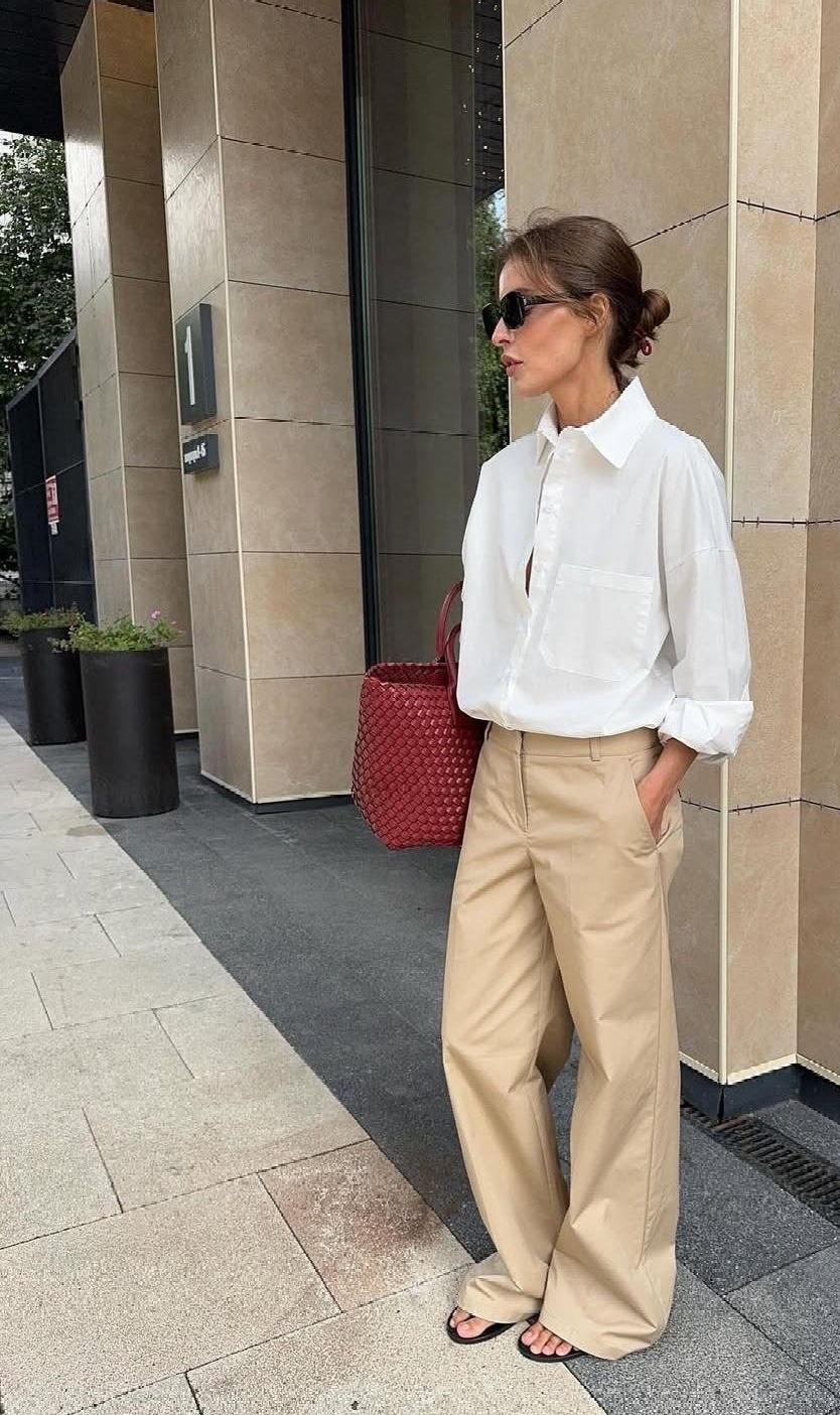 2. Для офиса: бежевые брюки в паре с небрежно заправленной белой рубашкой и темно‑синим или серым блейзером. На ноги — лоферы или аккуратные мюли, а сверху можно добавить тренч или пальто в тон одному из элементов, и привычный дресс‑код сразу выглядит актуальнее.