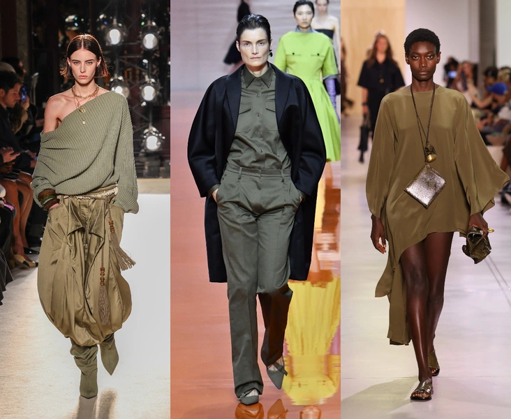 В модных коллекциях 2026 года оливковый звучит особенно уверенно: у Balmain — в мягком и «воздушном» атласе и трикотаже, у Dior — в плотной шерсти и коже, а у Michael Kors — в женственных силуэтах.