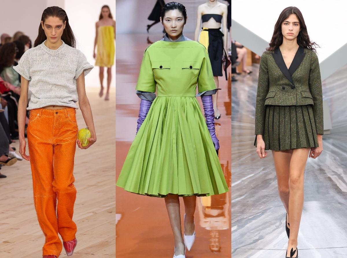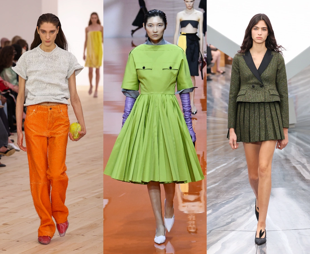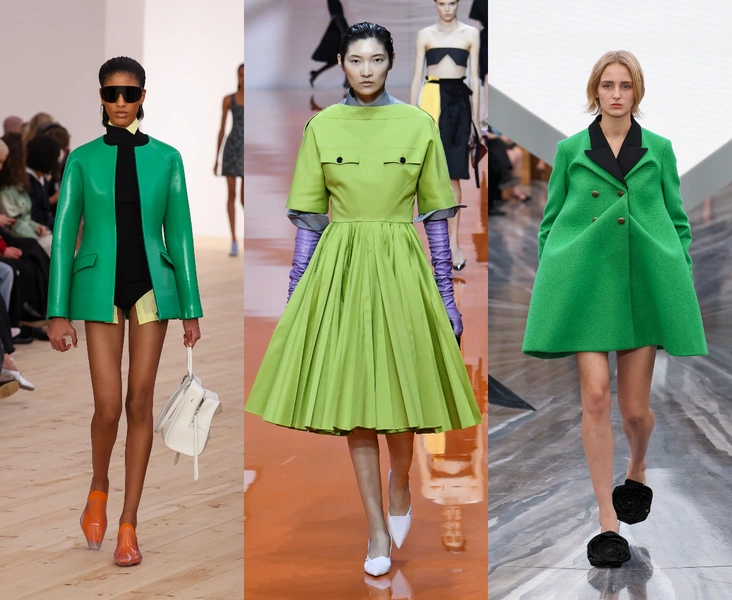 Зеленый в 2026‑м — это символ обновления во всех смыслах: дизайнеры сделали ставку именно на самый живой оттенок — не пастельный мятный, а густой лайм, который работает как визуальный источник энергии. У Dior он заявлен в лаконичных пальто с архитектурным кроем, а у Loewe — в виде ярких акцентов, вспыхивающих на фоне монохрома.
