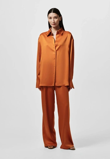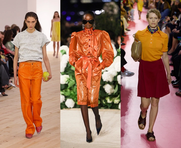 На Неделях моды дизайнеры играли с этим цветом особенно смело: у Saint Laurent он появился в коже и замше, а у Ferragamo — в шелковистых платьях с размытым градиентом — современный оранжевый больше не «кричит», а мягко сияет.