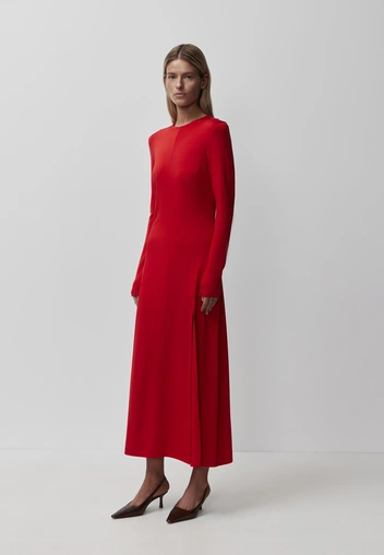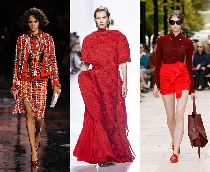 На подиумах мы видели целую диалектику красного: у Chanel — твидовые костюмы и перчатки, у Bottega Veneta — роскошные платья, у Celine — деликатные детали с намеком на рок‑романтику.