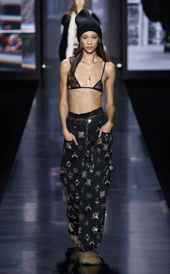 Вторая тенденция в мире денима — джинсы с блестящими деталями. Подойдут и вышивки, и пайтеки, и фигурные украшения из камней, расположенные по всей длине.